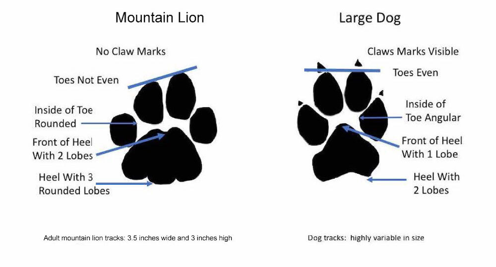 Track width: 3-4 inches across, asymmetrical, four toes with no claw marks visible (retractable claws). Mountain lion tracks are significantly larger than domestic cat prints but can be confused with canine prints. Note the distinct M-shaped heel pad and lack of nail impressions.